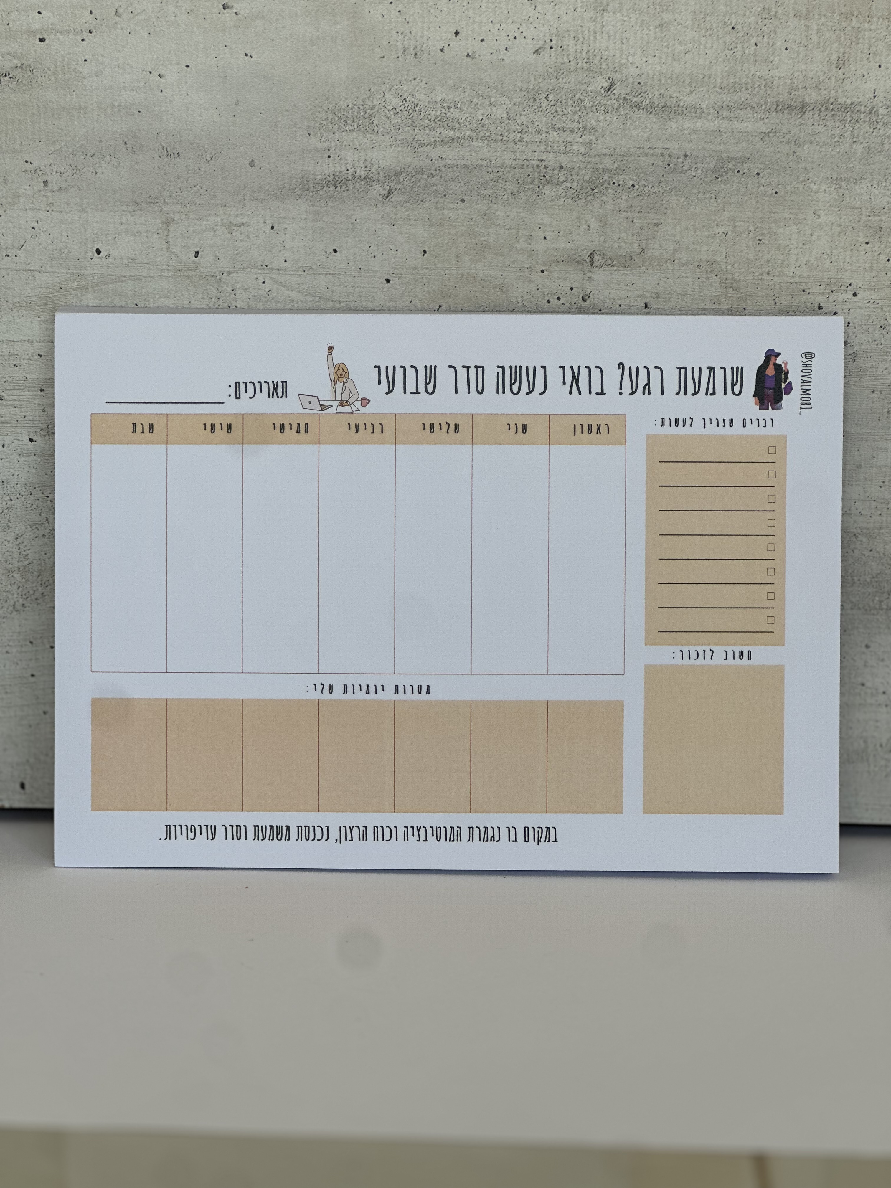 פלאנר שבועי עם 50 דפים עבים, עיצוב מינימליסטי ונקי, אידיאלי לתכנון לו״ז מפורט, להספיק לנצל כל יום בצורה הטובה ביותר.